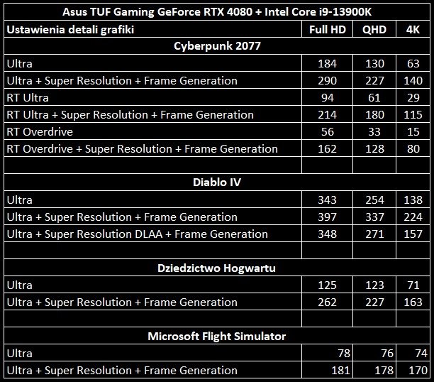 Przy ustawieniach RT Ultra gra na karcie graficznej Asus TUF Gaming GeForce RTX 4080 sparowanej z procesorem Intel Core i9-13900K osiąga średnią wydajność 29 klatek animacji na sekundę. Niewiele, nie? Wystarczy jednak skorzystać z DLSS-a i po aktywowaniu technologii Super Resolution oraz Frame Generation zyskujemy przyrost wydajności wynoszący niemal 300% i aż 115 klatek animacji na sekundę w rozdzielczości 4K.