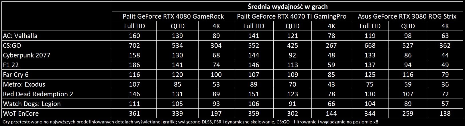To, że według pierwotnych planów karta miała być przeznaczona do zabawy w 4K, w naturalny sposób potwierdza jej wysoką wydajność – i znajduje to odzwierciedlenie w testach. Z maksymalnego poziomu detali trzeba tu zejść w zasadzie jedynie w przypadku najbardziej wymagających tytułów, jak Cyberpunk 2077 czy Metro Exodus. Patrząc na średnią wydajność, produkcje te – po sparowaniu z Ryzenem 9 5900X – nie mogą przekroczyć 50 klatek na sekundę. Przekłada się to na ogólne wrażenia z gry: gdy robi się gorąco, spadki wydajności są odczuwalne i należy po prostu obniżyć trochę detale wyświetlanej grafiki. Na szczęście obydwa tytuły wciąż wyglądają po tym bardzo dobrze. W niższych rozdzielczościach jest oczywiście lepiej: Palit RTX 4070 Ti GamingPro to karta, która pozwoli wam pograć we wszystko w QHD, a do tego będziecie mieli naprawdę duży zapas mocy na przyszłość. Po szczegóły odsyłam do tabeli.