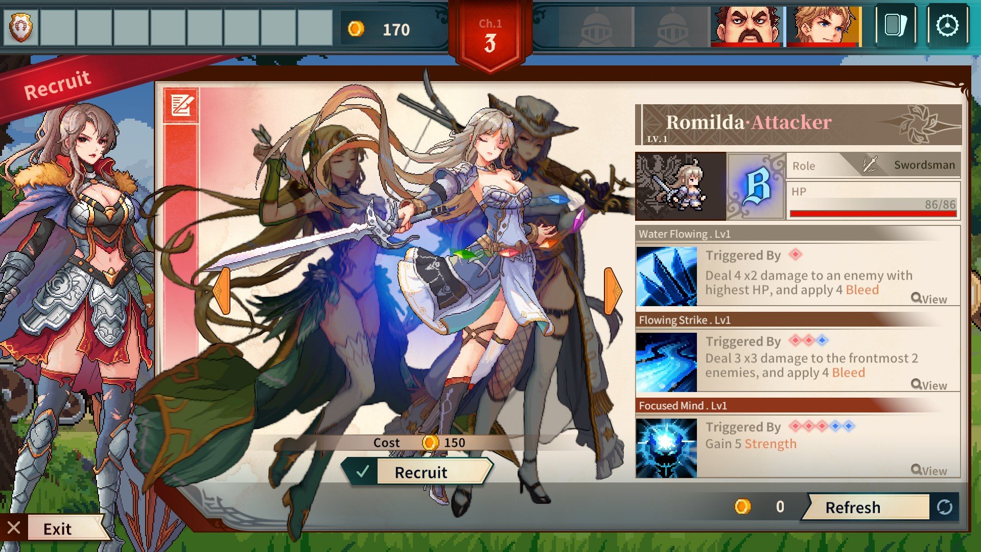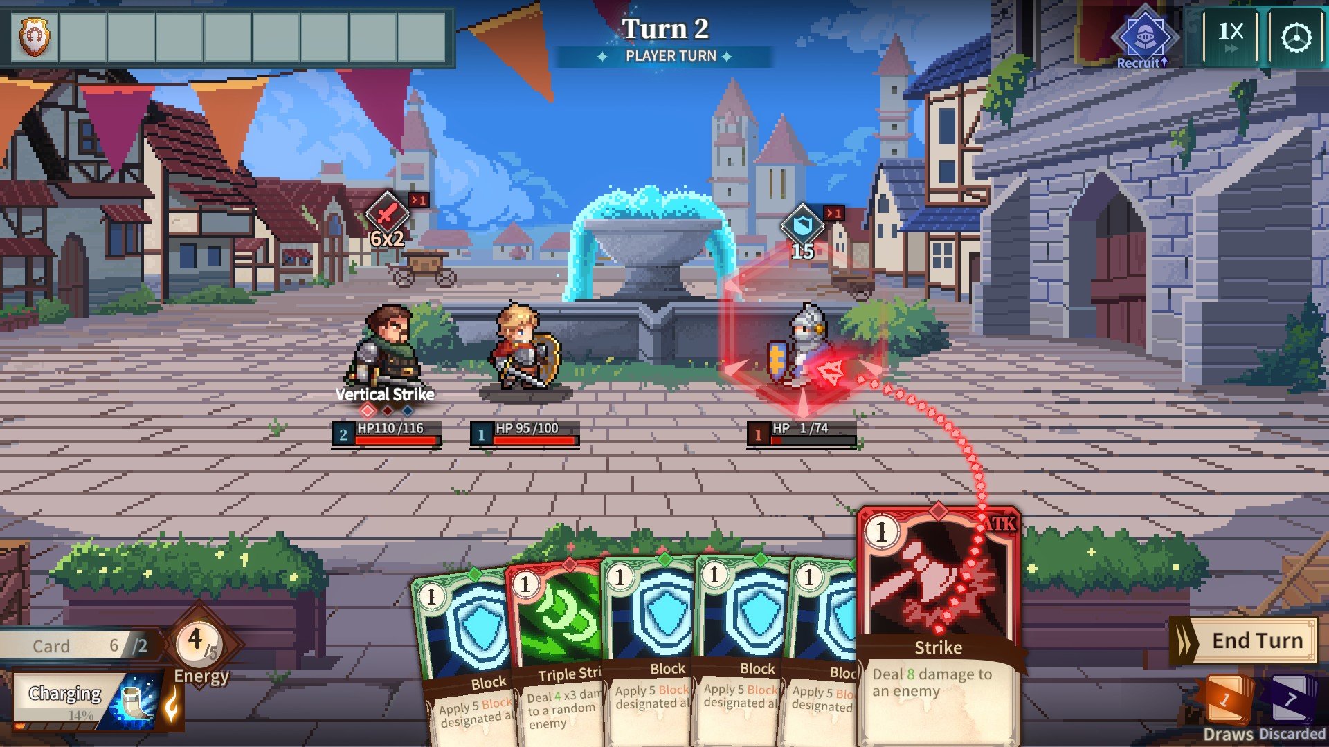 Do dyspozycji otrzymujemy zestaw kart, z których korzystamy, by wywoływać konkretne akcje, oraz bohaterów posiadających unikalne umiejętności, mogące się przydać, gdy wpadniemy w tarapaty. Po przeciągnięciu na przeciwnika lub członka drużyny wspomniane karty uwalniają swoje właściwości, aktywując przyjemne dla oka animacje walczących postaci. Podczas tury możemy użyć pięciu „kartoników”, po czym nadchodzi kolej na oponenta – ta wymiana trwa tak długo, aż ktoś padnie. Zwykle jednak potyczkę toczymy dosłownie przez kilka rund, z pomniejszymi przeciwnikami najczęściej trzy lub cztery. Szybkość, z jaką się to odbywa, i casualowy poziom trudności (choć można wybrać też wyższy; warto również zauważyć, że demo to początek gry) sprawiają wrażenia zbliżone do Half Minute Hero(*). Właśnie w tej dynamice upatruję największą zaletę produkcji, jeżeli bym miał patrzeć na nią zupełnie obiektywnie.