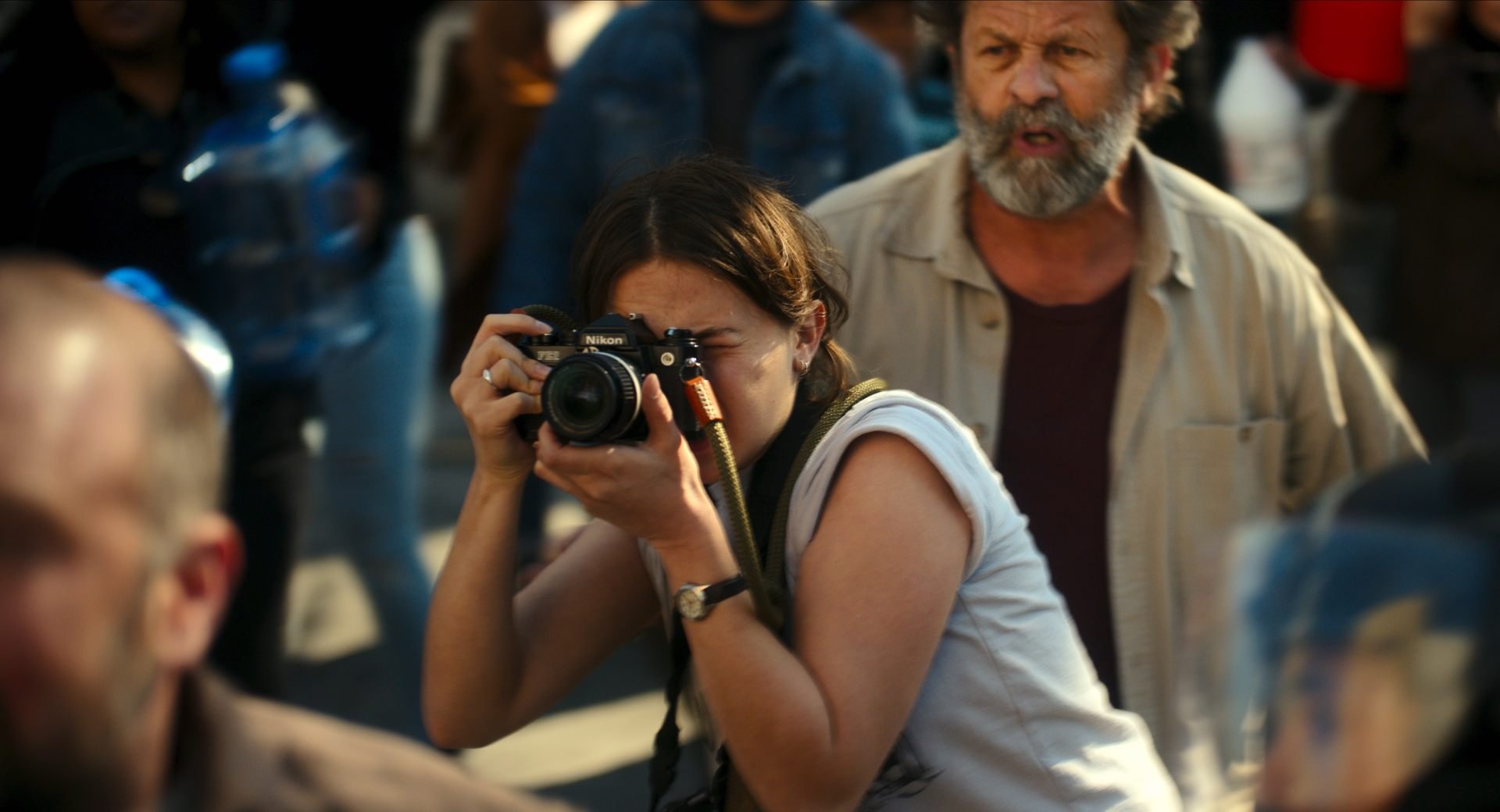 Uzewnętrznienie przychodzi jednak w przerwach pomiędzy robieniem i wywoływaniem zdjęć. Wcielający się w Joela (imię zresztą nieprzypadkowe, reżyser to fanatyk The Last of Us) Wagner Moura stawia na głośny krzyk złości bądź rozpaczy, w lepszych chwilach zbywa świat ironią, śmiechem, a nawet niezdrowym podnieceniem możliwością przebywania na pierwszej linii ognia obok sił specjalnych. Nieopierzona 23-letnia Jessie (w tej roli Cailee Spaeny) pozwala sobie na rzewny płacz. Lee stara się trzymać nerwy na wodzy, choć na jej twarzy wypisany jest zawsze tysiąc słów – to, co na początku wydaje się znieczulicą i zobojętnieniem, szybko przeradza się w zmęczenie, niemoc i egzystencjalny ból. W przypadku Sammy’ego, weterana New York Timesa, przeważają zaś spokój i tęsknota za normalniejszymi czasami.