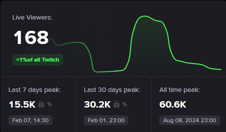 O tej godzinie niska bieżąca oglądalność jest normalna. Bardziej martwiące wydają się jednak dane pokazujące rekordy oglądających jednocześnie. Jak widać – szczyt (60 tysięcy osób) został osiągnięty latem 2024 roku, kiedy trwały pierwsze playtesty. Z kolei szczyt z ostatnich 30 dni – w przedziale czasowym, w którym odbyła się prawdziwa premiera – to zaledwie połowa tego. Ukazanie się pełnej wersji produkcji przeszło więc prawie że niezauważone.