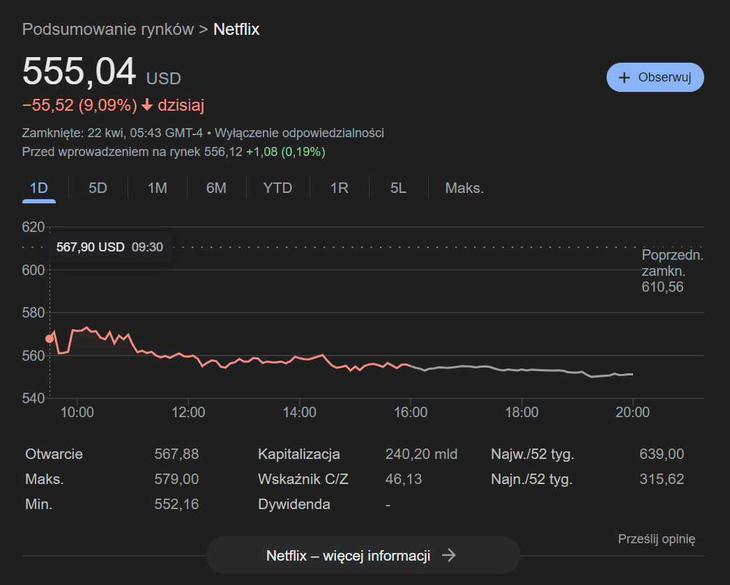 W związku z powyższym ceny akcji serwisu zaliczyły swój najwyższy spadek od lipca ubiegłego roku, a ich obecna cena wynosi 555,04 dolarów i nic nie wskazuje na to, aby miała wzrosnąć w ciągu najbliższych dni.