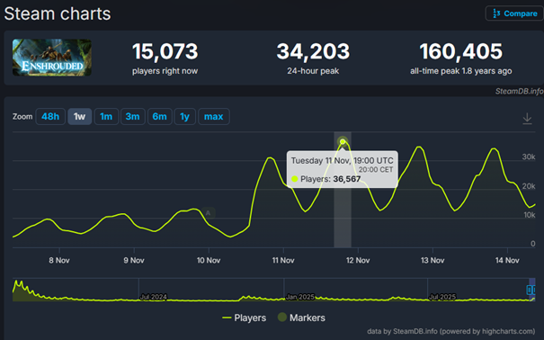 Według statystyk SteamDB, dzień po wydaniu patcha 10 listopada Enshrouded przekroczyło barierę 36 000 graczy. Wszystko dzięki obiecanemu już na Gamescomie 2025 patchowi zawierającemu to, o co fani tak prosili: wodę. Patch bowiem zapowiedziano już w sierpniu i od tego czasu gracze cierpliwie czekali.