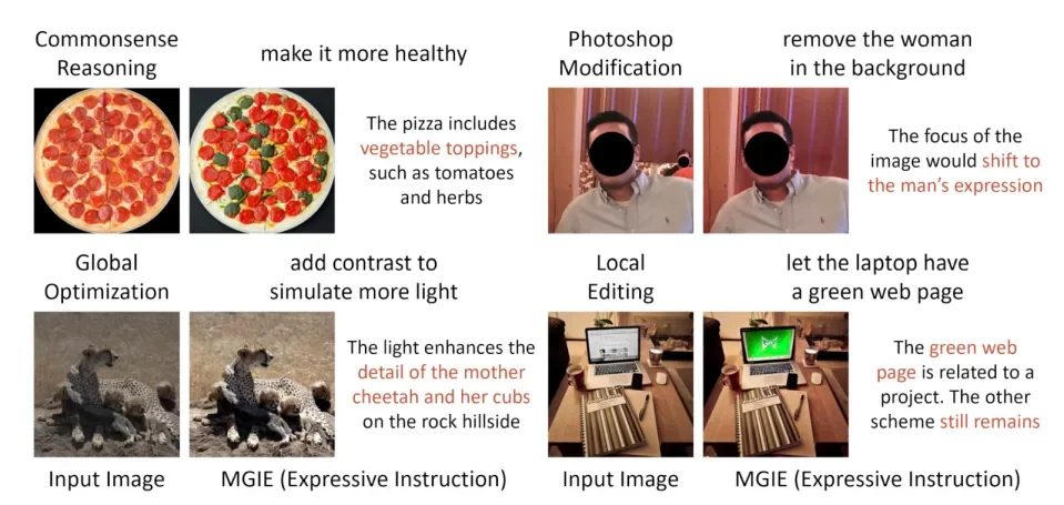 Jak możemy zauważyć na podstawie powyższej grafiki, MGIE może zostać poproszone m.in. o sprawienie, że widoczna na zdjęciu pizza będzie zdrowsza, w związku z czym na jej wierzchu pojawi się nieco ziół i pomidorów. MLLM-Guided Image Editing może nas także wyręczyć w kadrowaniu zdjęć oraz ich podstawowej obróbce, wliczając w to dostosowywania kontrastu, nasycenia barw i jasności.