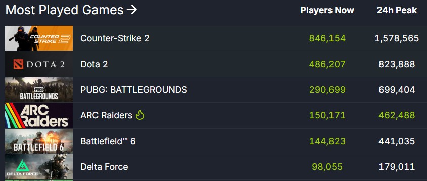 Nie oznacza to rzecz jasna, że ARC Raiders rozeszło się w większej liczbie sztuk, niż Battlefield 6, niemniej powyższe dane wskazują, iż pierwszy z nich jest w trakcie trendu wzrostowego i niewykluczone, że przez najbliższy czas to właśnie ARC Raiders będzie trzecią najpopularniejszą strzelanką na Steamie, zaraz po Counter-Strike’u 2 i PUBG. Notabene za parę dni do tej rywalizacji dołączy wspomniane Call of Duty: Black Ops 7, które zadebiutuje 14 listopada.