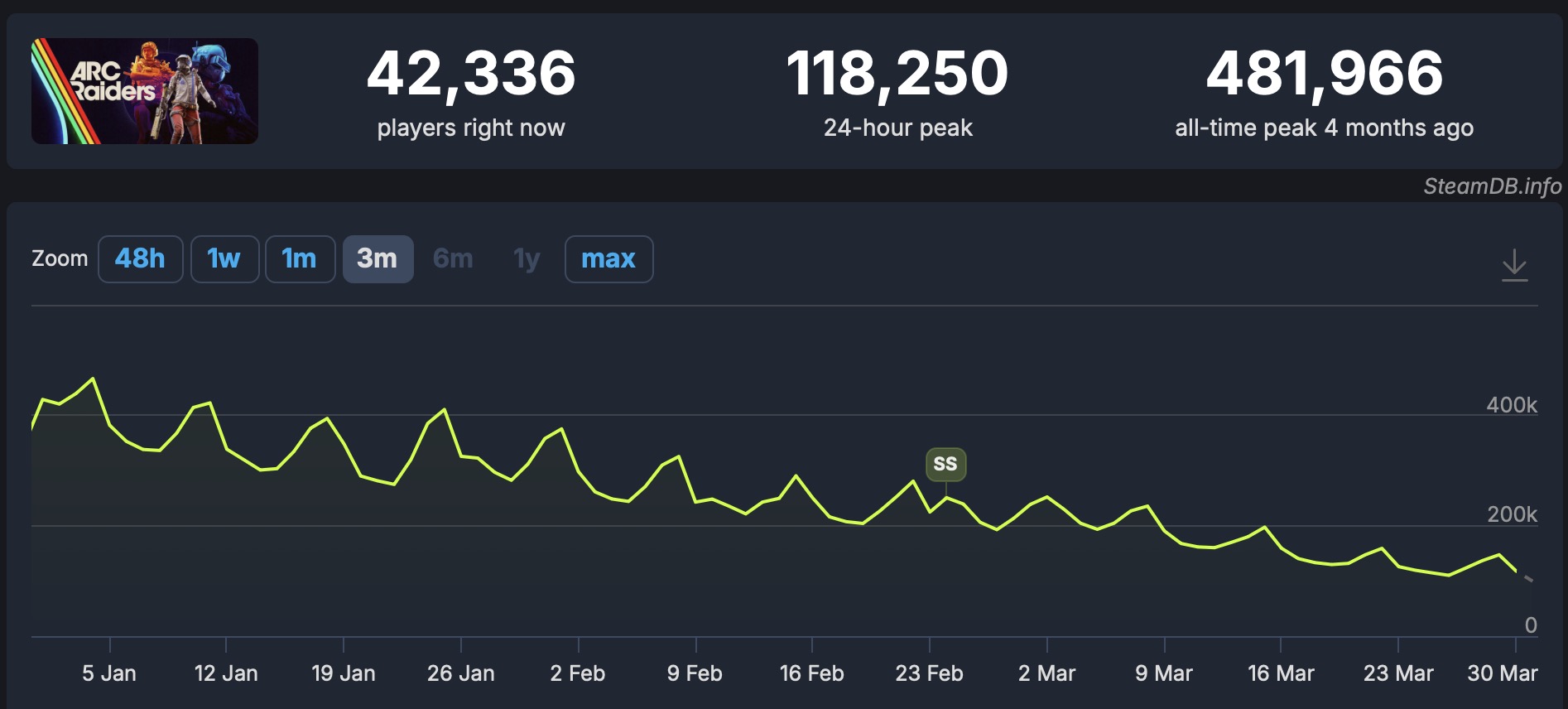 Debiutująca dziś aktualizacja z pewnością chwilowo zwiększyła zainteresowanie grą. W ciągu ostatnich 24 godzin w ARC Raiders w szczytowym momencie grało ponad 118 tys. użytkowników Steama, co (choć jest naprawdę imponującym wynikiem) sugeruje, że pula aktywnych fanów wciąż się kurczy, mimo systematycznego dodawania nowej zawartości.