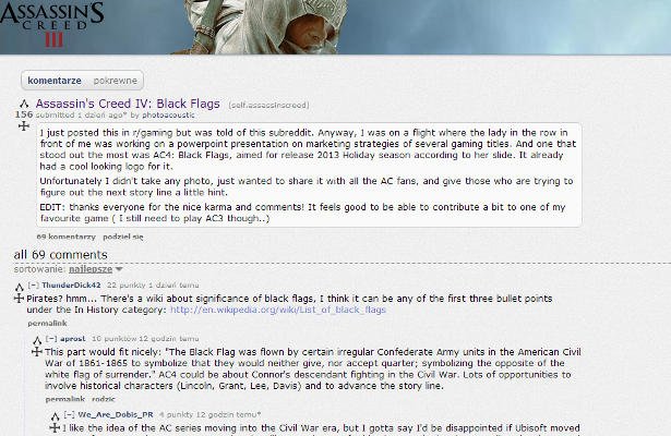 Plotka nie mówi nic więcej (poza faktem, że logo było „coolerskie”), ale w sieci można znaleźć kilka newsików, które ją uzupełniają. Ktoś inny słyszał bowiem dwóch facetów od marketingu w San Francisco, którzy mówili coś o „Black Flag”, zaś serwis Examiner, nie do końca tłumacząc dlaczego, twierdzi, że nowy Assassin’s Creed będzie osadzony w realiach pirackich.