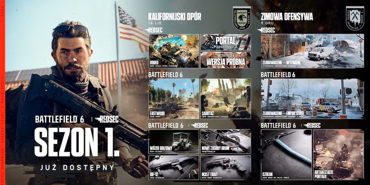 Dotarliśmy do połowy pierwszego sezonu Battlefielda 6, a wraz z nim udostępniono zawartość związaną z aktualizacją Kalifornijski Opór. Wprowadzono m.in. mapę Eastwood, a także tryb Sabotażu, w którym 8-osobowe drużyny co rundę zamieniają się rolami obrońcy i atakującego, gdzie pierwsi muszą bronić cenny ładunek, a drudzy – zniszczyć go wszelkimi możliwymi środkami. W opisie owego patcha znajdziemy zaś informacje o czasowym darmowym dostępie do trybu wieloosobowego gry, rozpoczynającym się 25 listopada, a kończącym 3 grudnia.