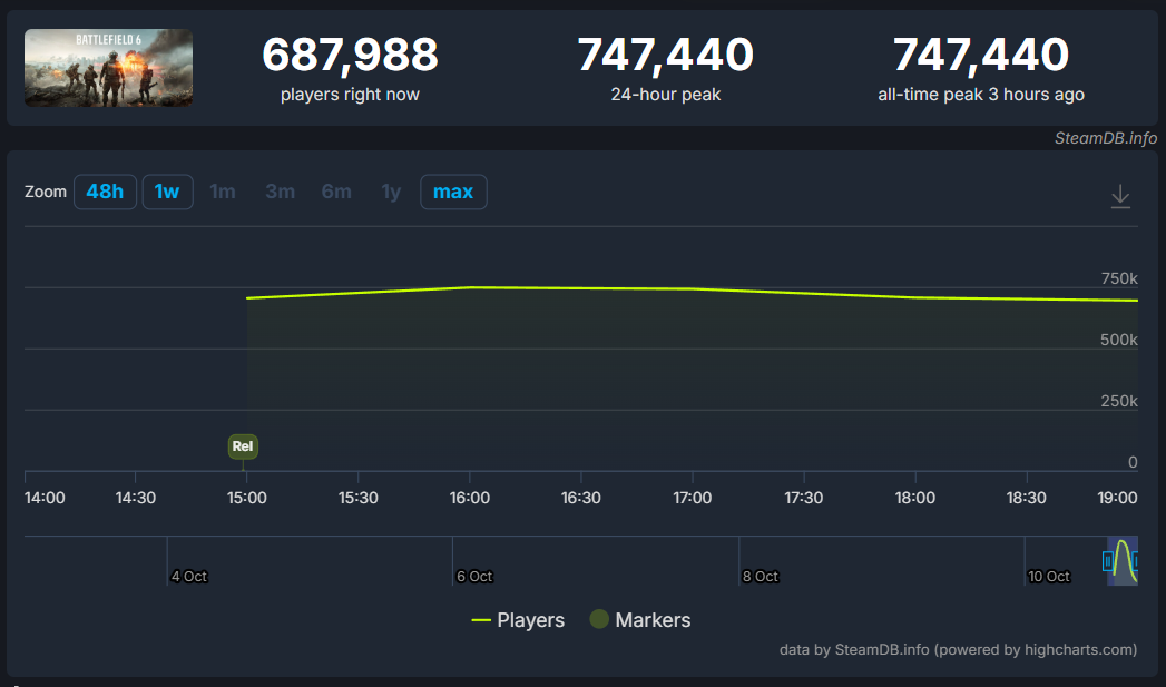 Start Battlefielda 6 na Steamie okazał się spektakularnie dobry. Już około godzinę po premierze produkcja zanotowała pierwszy rekord liczby graczy – w strzelankę jednocześnie grało prawie 750 tysięcy ludzi tylko na platformie Valve. Jako że przed nami weekend, prawdopodobnie możemy spodziewać się szybkiego pobicia tego rekordu.