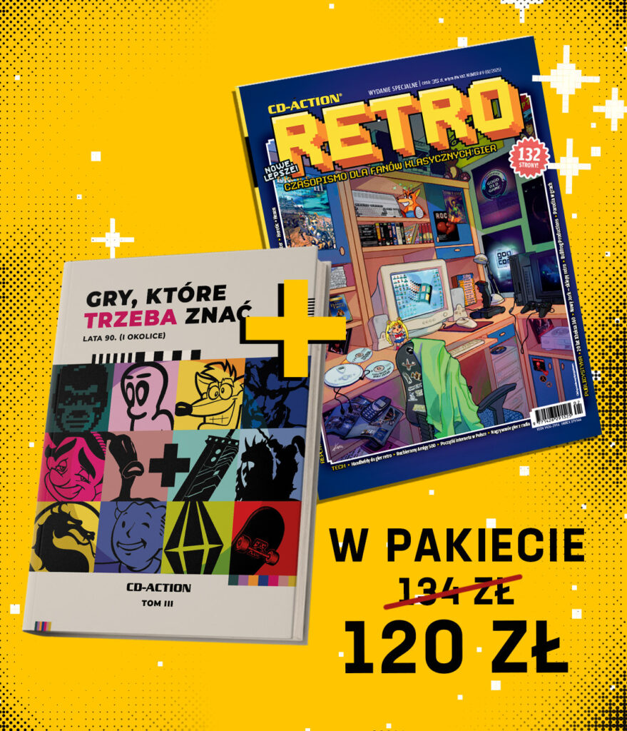 - Paczka z lat 90.! Retro #9 i książka „Gry, które trzeba znać” – Tęsknisz za ulubionymi grami z młodości? Oto pakiet zapewniający solidną dawkę nostalgii! W jednej przesyłce i w obniżonej cenie kupisz trzeci tom naszej książki, aż 400 stron o grach z lata 90. i 80., oraz najnowszy numer Retro (#9), wraz z którym solidnie odświeżamy formułę magazynu. Cena: 120 zł (zamiast 134 zł).