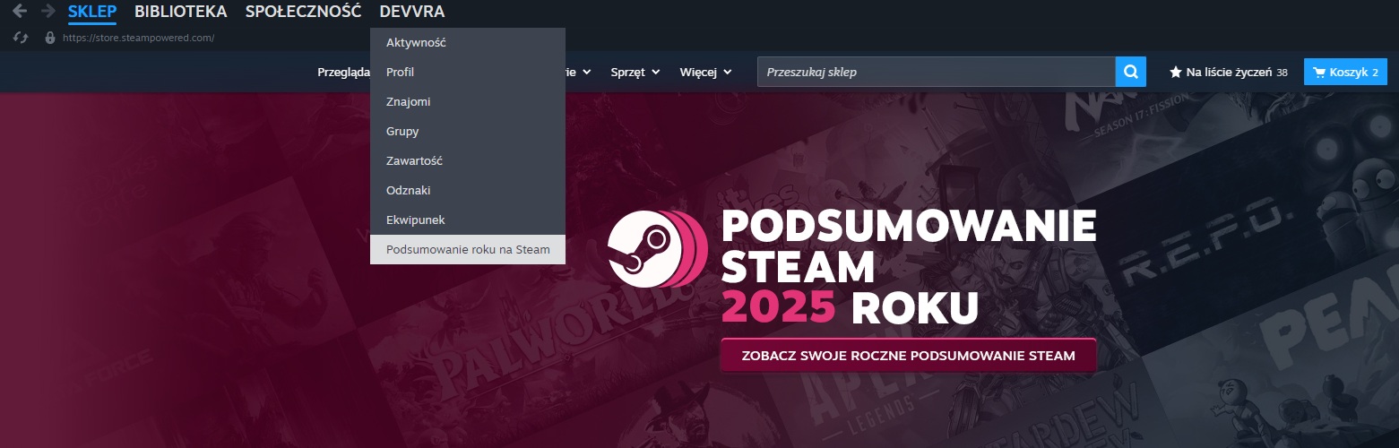 Podsumowanie roku możemy znaleźć następująco. W aplikacji na komputery stacjonarne musimy albo kliknąć w nazwę swojego nicka (w moim przypadku to „Devvra”) i wejść w „Podsumowanie roku na Steam” albo, jak widać na załączonym obrazku, kliknąć w „Zobacz swoje roczne podsumowanie Steam” w sklepie.