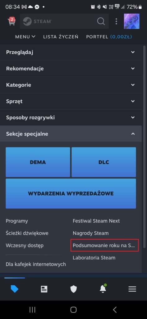 W aplikacji na telefony znajdziemy nasz growy „bilans” pod Menu > Sekcje specjalne > Podsumowanie roku Steam.