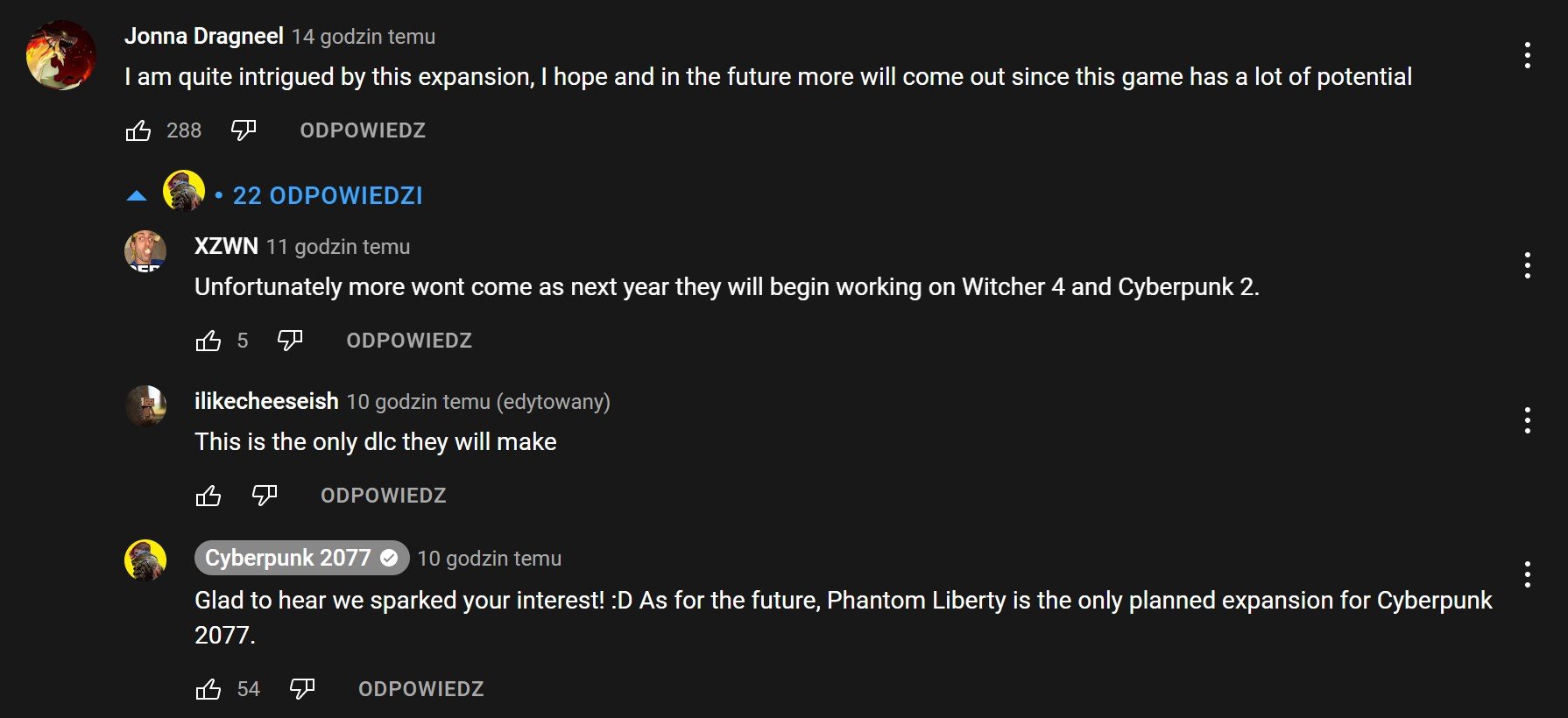 Taką informację znajdziemy w komentarzach pod oficjalnym trailerem dodatku. Kanał Cyberpunka 2077 podzielił się nią w odpowiedzi na komentarz jednego z widzów, który wyraził nadzieję, że w przyszłości pojawi się więcej rozszerzeń, które rozwiną potencjał gry. Nie zdziwiłbym się, gdyby CD Projekt Red porzucił plany na drugie DLC, chcąc jak najszybciej poświęcić się kolejnemu Wiedźminowi… a może nawet Cyberpunkowi 2078?