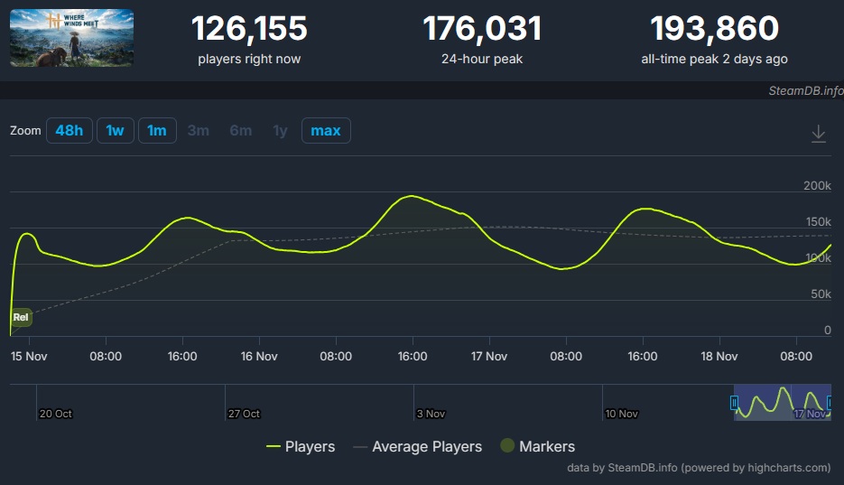 I rzeczywiście, jeśli spojrzymy na SteamDB, to naszym oczom ukaże się peak na poziomie 193 tysięcy grających jednocześnie osób. Oznacza to, że Where Winds Meet prześcignęło pod tym względem Clair Obscur: Expedition 33, dla którego ten wynik wyniósł 145 tysięcy graczy, i zbliżyło się do wyników remastera Obliviona (216 tys.) czy fenomenu ostatnich tygodni, czyli Dispatch (220 tys.).