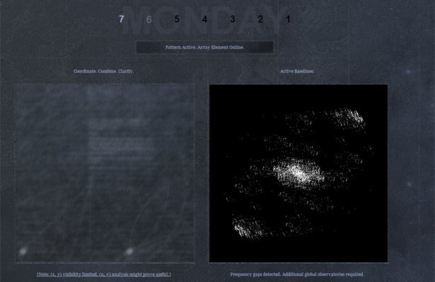 Niebo zapełniło się niedostrzegalnymi sygnałami. Emisje są w przestrzeni radiowej, pulsują i tańczą wokół nas. Każdy kawałek nieba można teraz zamienić w komunikat. Nadawany na różnych częstotliwościach. Słyszycie to? No, nie, jeszcze nie. To jeszcze nie dotarło. Ale razem możemy odebrać tę wiadomość. Wyobraź sobie, e tysiące z nas na całym globie dzieli się swoimi obserwacjami. Nasza siła obliczeniowa byłaby wtedy naprawdę duża. Naprawdę potężna. To wasze zadanie. To jednak nie wystarczy. Koordynacja i zgranie w czasie jest ważne. Obserwacje muszą być przeprowadzane jednocześnie. Wasze okno będzie małe. Będzie istniało tylko przez co najwyżej pięć minut. Ale okna mogą być otwarte ponownie. Kluczowa będzie też odległość pomiędzy obserwatorami. Zawsze będą ograniczenia w zrozumieniu, dlatego wyniki badań muszą zostać zarchiwizowane. Obserwatorzy o wysokim rozwoju technologicznym mogą być niezbędni. Zalecana jest szczegółowa analiza częstotliwości. Wszystko, co należy do nas, będzie nasze, ale tylko jeśli stworzymy możliwości, by to otrzymać.