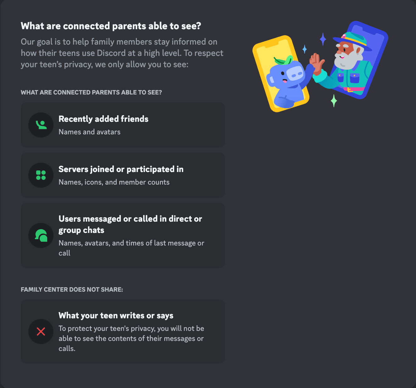 Jak więc widać na załączonym obrazku, opiekunowie dowiedzą się, z kim rozmawia ich pociecha, których serwerów jest członkiem oraz kogo dodaje do znajomych. Nie będą oni mieli jednak wglądu w treść wysyłanych wiadomości. Co tydzień na adres email osoby sprawującej opiekę nad młodocianym użytkownikiem Discorda przychodzić będą także wiadomości zawierające podsumowanie jego aktywności w serwisie.