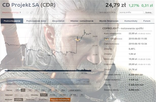 Przez chwilę za udziały firmy mogliśmy dostać nawet imponujące 25, 65 zł. CD Projekt wskoczył tym samym na pozycję najpopularniejszej z notowanych na warszawskiej giełdzie spółek. Obrót akcjami CDP przekroczył w ostatnim tygodniu 5 mln złotych.
