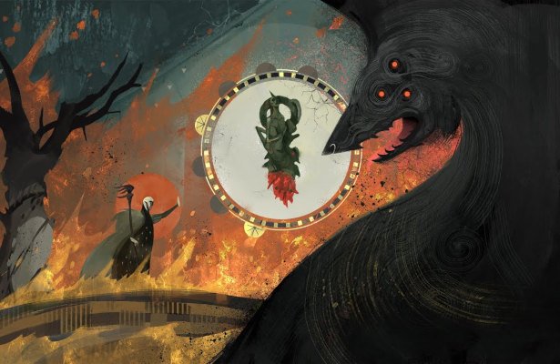Stylizowany symbol chaosu? 8 ramion, każde w inną stronę, w grach już występowało. Na malowidle „Zniszczenie Tytana” w samym centrum, ale zakryte przez zaświatło. Mnie osobiście najbardziej intryguje podobieństwo do Mythal biorąc pod uwagę charakterystyczny „róg” na czole. Podobny nosiła Flemeth/Mythal i tak samą Mythal przedstawiały posągi elfów. Ciekawe jest też czy szczypce chwytające wszystkie postaci od dołu to przenośnia artystyczna czy przyszły boss 😀