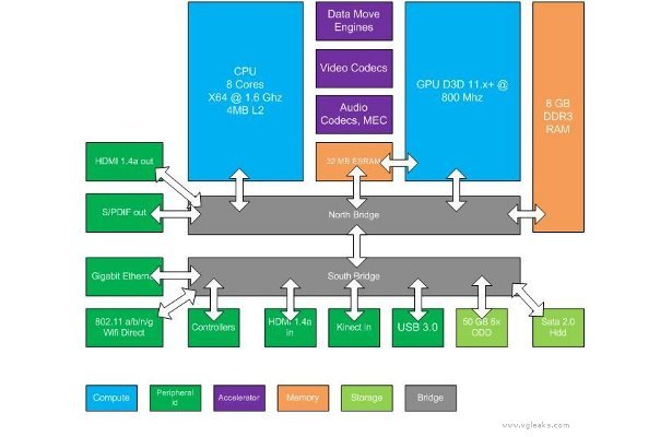 Zgodnie z przeciekiem nowy Xbox bazował będzie na ośmiordzeniowym procesorze AMD, opracowanym w technologii Jaguar i taktowanym zegarem o częstotliwości 1,66 GHz. Podobny procesor ma być zainstalowany w Orbisie (ale najpewniej taktowany wyżej, być może z większą liczbą rdzeni), konsola Microsoftu podchodzi jednak inaczej do kwestii pamięci – według VGLeaks nowy Xbox to 8GB pamięci RAM (na kościach DDR3) oraz 32MB pamięci SRAM, które na różne sposoby wspierają różne komponenty konsoli – w zależności od potrzeb układy graficzne, kiedy indziej Kinecta, itd.