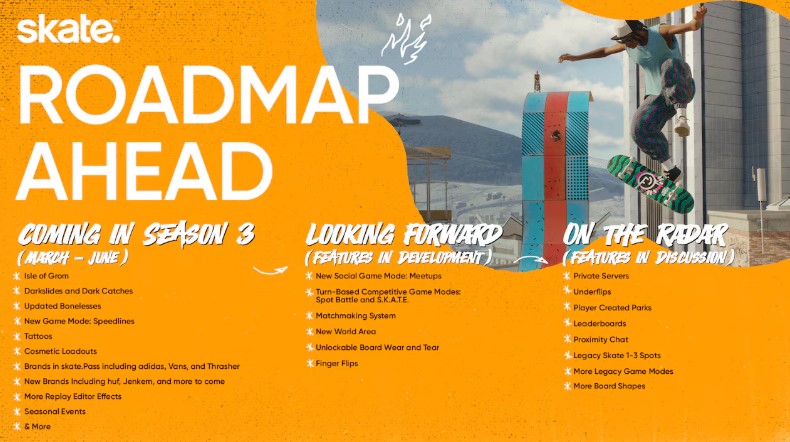 W tym miejscu warto również przypomnieć nadchodzące plany wobec tytułu, które pojawiły się na oficjalnej stronie skate. w zeszłym tygodniu. Opublikowana roadmapa zapowiada start sezonu 3 w najbliższym czasie oraz rozwój nowych trybów rozgrywki w późniejszym terminie. Miejmy nadzieję, że planowane zmiany podratują nieco stan gry, a studio nie ogłosi w najbliższym czasie kolejnej „transformacji”.