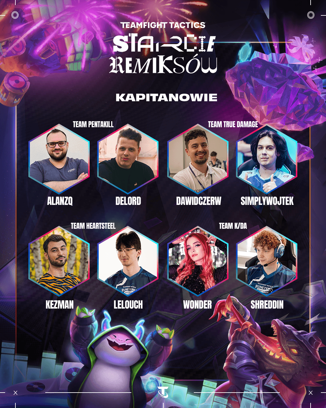 Do udziału w wydarzeniu zaproszone są nie tylko znane twarze z community TFT, ale również kreatywni twórcy spoza tego świata. Wśród kapitanów znajdą się Wonder (Muzyka), Delord (League of Legends), oraz Dawidczerw (Szachy). Nie zabraknie także znanych postaci ze społeczności, takich jak: Shreddin, Simplywojtek oraz Lelouch.