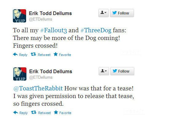 Erik Todd Dellums, aktor wcielający się w postać ThreeDoga w oryginalnej wersji językowej gry Fallout 3, umieścił – jak pisze „za pozwoleniem” – na swoim Twitterze wiadomość, która zdaje się być zapowiedzią Fallouta.