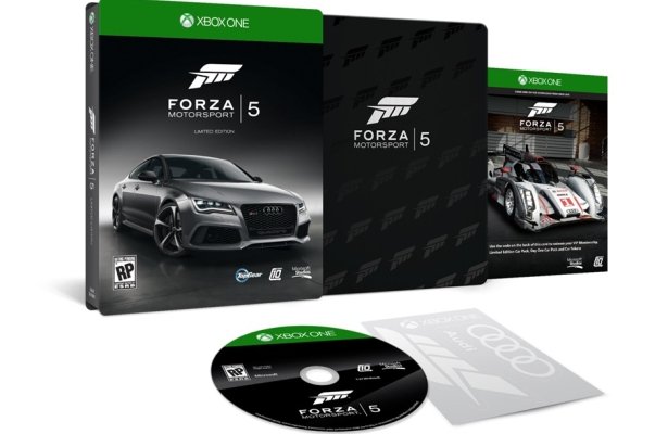 Limitowana edycja Forza Motorsport 5 zawiera dwa dodatkowe zestawy samochodów. W Limited Edition Car Pack znajdziemy 2011 Audi RS3 Sportback, 2012 Aston Martin Vanquish, 2013 Ford M Shelby Mustang GT500, 2013 McLaren P1 oraz 2013 SRT Viper GTS w specjalnych, limitowanych kolorach. Druga z paczek, Day One Car Pack, dorzuci do garażu samochody 2010 Audi TT RS Coupe, 2013 Ford Focus ST oraz 2011 Lamborghini Gallardo LP570-4 Superleggera – także w unikalnym kolorze. Dodatkowo otrzymamy członkostwo w klubie VIP umożliwiające m.in. uczestnictwo w specjalnych eventach oraz dające dostęp do kolejnych samochodów, tym razem 1965 Shelby Cobra 427 S/C, 1987 RUF CTR Yellowbird, 1991 Mazda #55 787B, 2011 Ford F150 SVT Raptor oraz 2011 Bugatti Veyron Super Sport. Na dokładkę naklejki na samochód z emblematami Xbox One, Forzy Motorsport 5 i Audi oraz 1250 jednostek growej waluty, która to suma pozwoli nam na dostęp do dowolnego samochodu. Całość opakowana w stylowe, a zarazem stalowe pudełko. Cena – 80 dolarów bez centa, czyli ok. 256 złotych.