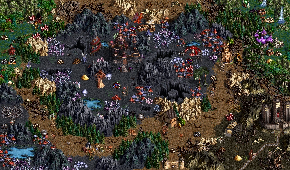 Dostaliśmy na przykład widok na mapę przygody i to nawet całkiem spory jej wycinek. Widać na nim m.in. kolejne budynki, dekoracje czy jednostki. Obstawiam, że większość z nowych struktur to po prostu siedliska stworzeń z Pałacu, ale pewnie dostaniemy też i inne dodatkowe budowle do odwiedzenia na mapie. A skoro zima, to widać też, że modyfikacja wprowadzi wiele znanych nam obiektów, tylko że w zaśnieżonej wersji. W końcu sporo budynków w Heroes 3 nie ma swojego zimowego odpowiednika.
