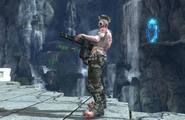Po prawej widać coś a’la portal. Natomiast te budynki po lewej coś strasznie mi przypominają o najnowszym Tomb Raiderze. I na koniec- bóstwo wyglądające kropka w kropkę, jak zbir z universum Batmana, w dodatku z aureolą i minigunem. |Jakoś mnie to nie przekonuje. Timeshift był fajny, ale już w nim dało się wyczuć chęć zrobienia czegoś „ponad”, pokazania na siłę czegoś nowego (manipulacja czasem, co wcale nie jest nowe- POP!)… i nie za dobrze się to skończyło, bo gra na tym dużo straciła.