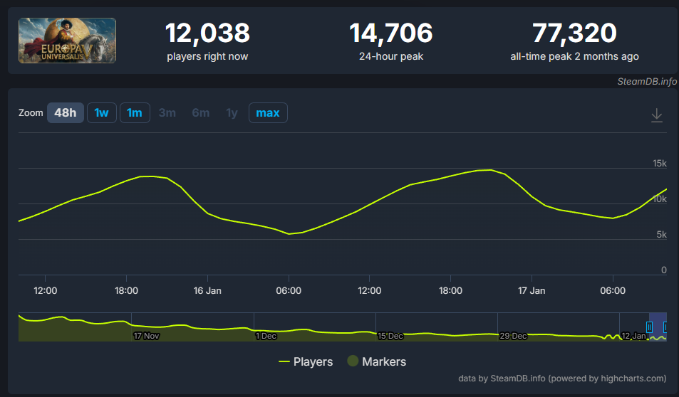 Europa Universalis to jedna z największych marek na rynku gier z gatunku tzw. grand strategy. Również piąte wcielenie serii cieszy się sporą popularnością – 2 miesiące temu prawie 80 tysięcy osób bawiło się w nim jednocześnie, przebijając znacząco wynik Europy Universalis 4 (maksymalnie niecałe 50 tysięcy podczas szczytu pandemii COVID-19). O ile sytuacja „czwórki” – która cieszy już od długich lat – jest jednak zupełnie stabilna, o tyle w wypadku „piątki” można zaobserwować tendencję spadkową. Zauważył to użytkownik Reddita o pseudonimie No-Imagination2292.