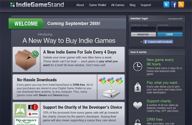IndieGameStand to serwis, w którym będzie można kupić niezależne produkcje za dowolną sumę. Nowe gry objęte promocją pojawiać się mają co 96 godzin. Nie będą posiadały zabezpieczeń DRM, a 10% z przeznaczonej na nie kwoty wędrować ma organizacji charytatywnych wybranych przez developerów.