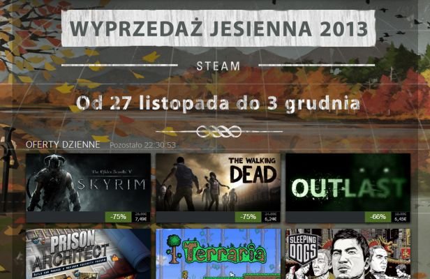No i znowu nadszedł ten czas, kiedy trzeba pożegnać się ze sporą ilością pieniędzy. Jesienna wyprzedaż na Steamie, edycja 2013. Potrwa od dzisiaj do 3 grudnia, a co można kupić? Pierwszego dnia przeceniono Skyrim, The Walking Dead, Sleeping Dogs... i wiele innych.