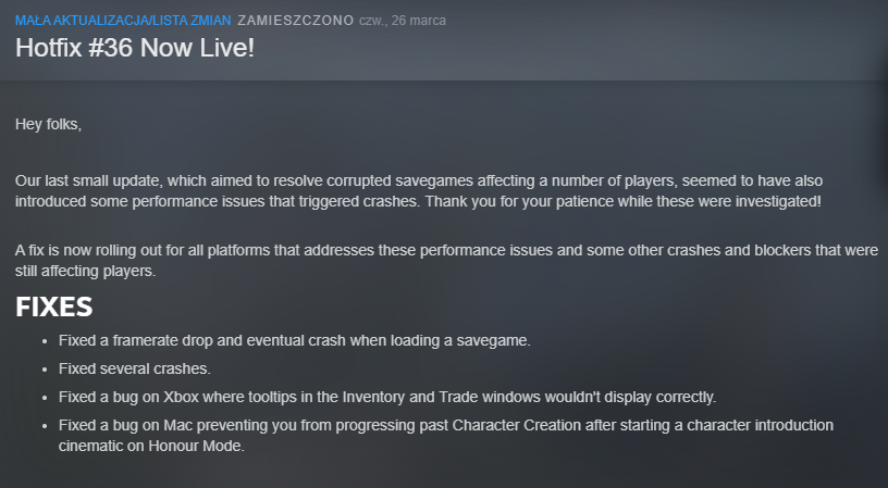 Jak przeczytamy w poście na Steamie, aktualizacja jest niewielka, ale naprawia znaczące błędy. Między innymi pożegnacie się z crashami, które potrafią zepsuć humor nawet najłagodniej usposobionemu człowiekowi. Ci z was, którzy lubią wyzwania i mają ochotę odpalić Baldura na Macu, wreszcie mogą też przejść dalej niż stworzenie postaci w Trybie Honoru, co wcześniej było niemożliwe.
