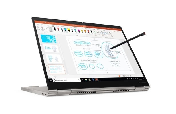 Oczywiście zbudowanie takiego laptopa nie byłoby możliwe bez zastosowania świetnego ekranu. Wyświetlacz zgodny z Dolby Vision o rozdzielczości 2256 x 1504 i proporcjach 3:2 wyposażono rzecz jasna w warstwę dotykową. Zawiasy 360 stopni umożliwiają z kolei dowolne ustawienie pozycji. Jeśli chodzi o pamięć – takowej nie zabraknie. Titanium Yoga może mieć do 16 GB RAM-u oraz szybki dysk PCIe do 1 TB. Wrażenie robi również łączność: mamy tu Wi-Fi 6 – a więc najnowszą wersję standardu komunikacji bezprzewodowej, która zapewnia stabilne i szybkie połączenie. A gdy potrzebujemy dostępu do internetu niezależnie od okoliczności, to możemy zdecydować się na opcjonalny modem 5G (eSIM) lub 4G – tak wyposażona Titanium Yoga umożliwi nam przeglądanie sieci z dowolnego miejsca, zupełnie jak w przypadku smartfona.