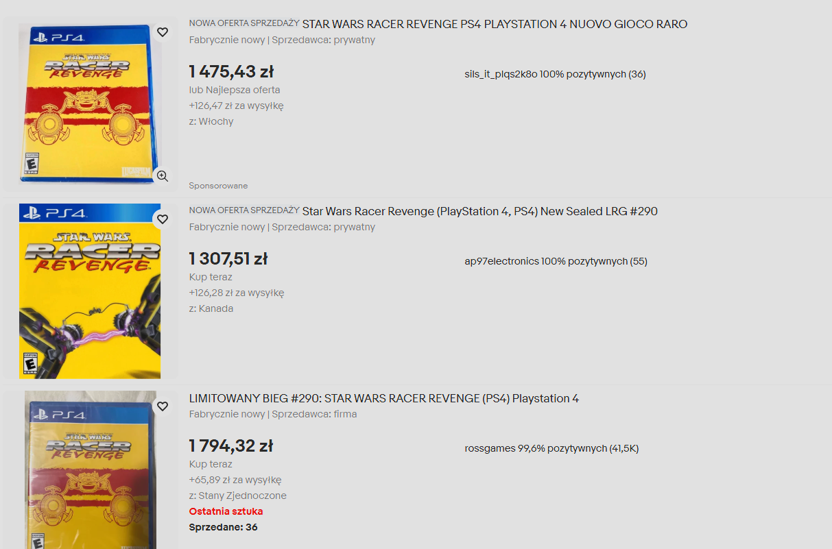 Jeśli kręci was temat gier z uniwersum Gwiezdnych Wojen, lubicie wyścigówki i z cyfrową rozrywką obcujecie nie od dziś, możliwe, że graliście w Star Wars Episode I: Racer wydane pierwotnie w 1999 roku na PC i Nintendo 64. Niewykluczone też, że obił wam się o uszy sequel produkcji na PlayStation 2 pod tytułem Star Wars Racer Revenge – może nawet macie w domu rzadką wersję pudełkową przeznaczoną na nowsze konsole PlayStation. Jeśli tak, zainteresujcie się spieniężeniem tego skarbu, który w momencie pisania jest na internetowych aukcjach wyceniany powyżej tysiąca złotych.
