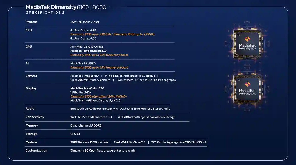 Zarówno pierwszy, jak i drugi układ korzystają z czterech rdzeni ARM-Cortex-A55 pracujących z częstotliwością 2 GHz oraz z czterech rdzeni Cortex-A78 – tutaj też pojawia się zasadnicza różnica między dwoma topowymi modelami MediaTeka. W przypadku układu 8100 rdzenie A78 rozpędzają się do 2,85 GHz, zaś model 8000 może pochwalić się częstotliwością 2,75 GHz. Kolejna różnica to częstotliwość odświeżania obrazu: mocniejszy układ obsłuży wyświetlacz o rozdzielczość WQHD+ z częstotliwością 120 Hz, zaś słabszy poradzi sobie jedynie z FHD+, osiągając przy tym 168 Hz. Ponadto Dimensity 8100 będzie nieco szybszy w trybie boost jeśli chodzi o wydajność układu graficznego oraz wsparcie dla AI.
