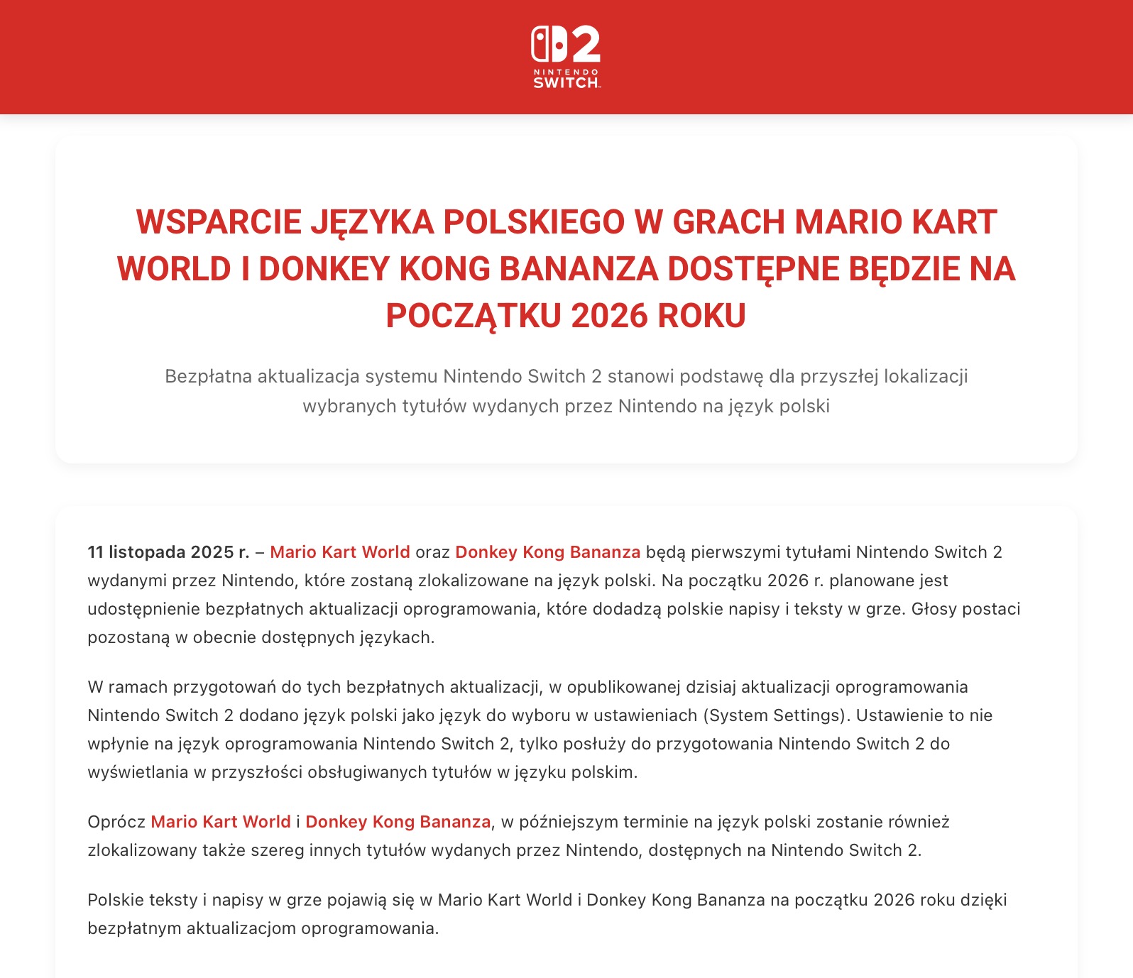 Nie bez powodu w ostatnim zdaniu użyłem jednak czasu przyszłego, bo choć w ustawieniach Switcha i Switcha 2 pojawiła się już opcja „Polish/English”, to na razie dotyczy ona jedynie wykrywania i aktywowania języka polskiego w grach. Na oficjalnej stronie Nintendo pojawił się za to wpis o nadchodzących spolszczeniach do Mario Kart World i Donkey Konga Bananzy. Posunięcie Japończyków to miły gest wobec polskich graczy, zwłaszcza że dziś (11 listopada) obchodzimy 107. rocznicę odzyskania niepodległości.