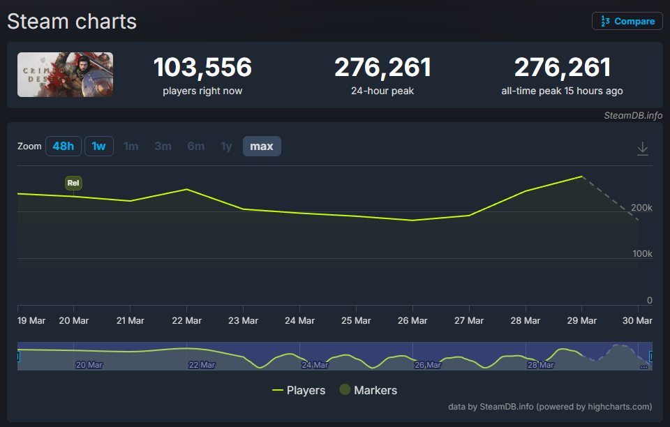 Jak widać na powyższym zrzucie ekranu, Crimson Desert osiągnęło wczoraj nowy rekord bawiących się jednocześnie – ponad 276 tysięcy graczy. W dniu premiery były to około 233 tysiące, co daje całkiem spory wzrost (szczególnie jeśli weźmiemy pod uwagę naturalny spadek zainteresowania z czasem). Wynika stąd, że koreańska produkcja nie powiedziała jeszcze ostatniego słowa i może czekać ją całkowite odkupienie po ambiwalentnym starcie – o ile już go nie osiągnęła.