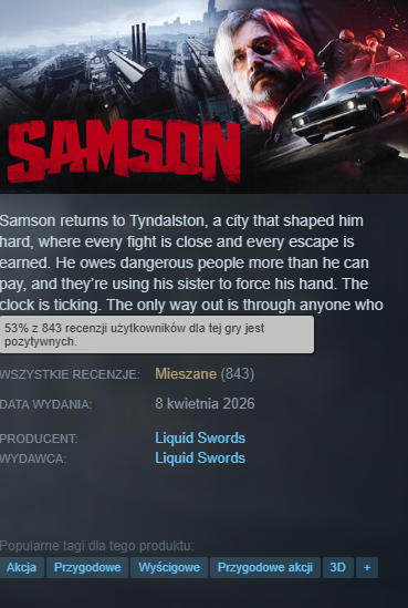 Według platformy Metacritic ocenę Samsona przez krytyków da się uśrednić do poziomu 48 na 100. W języku branży gier oznacza to nie tyle tytuł przeciętny, co po prostu kiepski. Równie nieciekawie sprawa wygląda na Steamie, gdzie gracze wydali mieszany werdykt: Samson spodobał się 53% użytkowników, którzy wystawili recenzję.