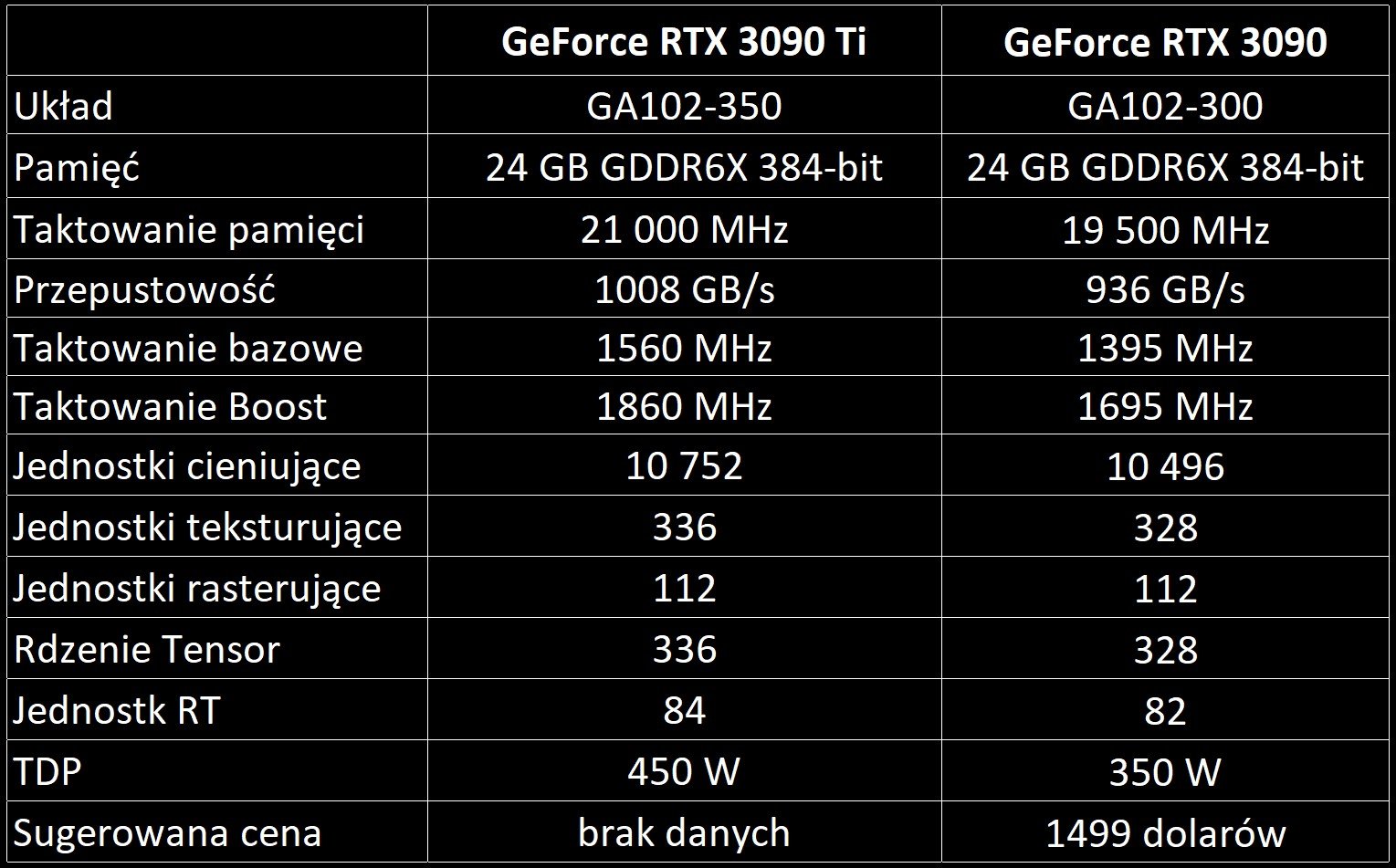 Nie jest tajemnicą, że Nvidia przymierza się do wypuszczenia mocniejszej wersji swojej dotychczas najlepszej karty graficznej. Najprawdopodobniej oficjalnie zobaczymy ją przy okazji prezentacji na targach CES 2022 (5-8 stycznia), specyfikacja jednak już teraz hula po sieci. Cóż, większych niespodzianek nie ma.