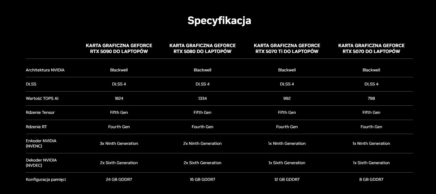 A jak prezentują się przenośne wersje kart z serii RTX 50 pod kątem parametrów? Poczynając od najsłabszej z ujawnionych pozycji, czyli RTX-a 5070, na ten moment wiemy, że zostanie on wyposażony w 8 GB pamięci GDDR7, 128-bitową magistralę pamięci i 4608 rdzeni CUDA. Wersja z „Ti” w nazwie posiada już 12 GB pamięci i 192-bitową magistralę, jak również nieco więcej, bo 5888, rdzeni CUDA. Pierwsza z kart posiada pobór mocy na poziomie 50-100 W, druga zaś – ok. 60-115 W.