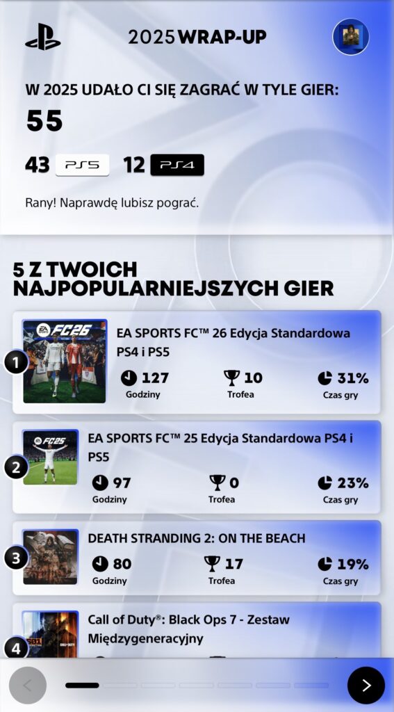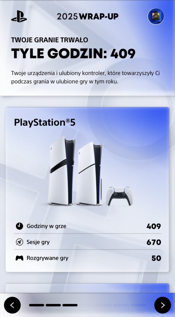 Swoje PlayStation Wrap-Up 2025 możecie sprawdzić w tym miejscu. Podsumowanie obejmuje konsole PlayStation 5 oraz PlayStation 4. W bardziej szczegółowych statystykach zobaczycie też dane dotyczące rozgrywki na kontrolerze PlayStation Portal, a nawet szczegóły na temat najczęściej używanego pada DualSense.