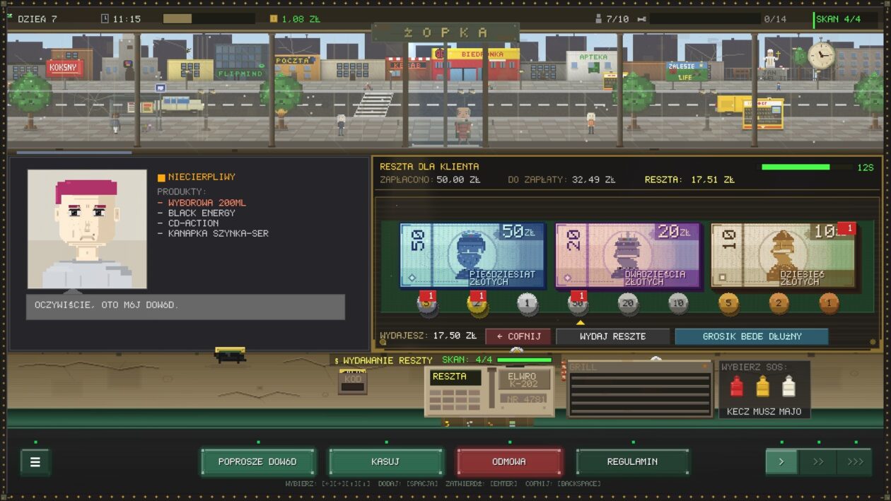 Twórca, naturalnie, nie ukrywa inspiracji klasykiem, czyli wspomnianym już Papers, Please, pokazując, że codzienne wykonywanie pozornie prostych obowiązków może przerodzić się w istny moralny koszmar i próbę charakteru. Jaka Parówa, Wariacie? Idzie dokładnie w tym samym kierunku, tylko zamiast granicy mamy ladę sklepową, a zamiast uchodźców i szpiegów panią Grażynę, babcię w berecie, lokalnych cwaniaczków, dresiarza płacącego bilonem i podobny koloryt naszego wspaniałego kraju