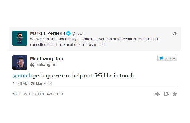 No dobrze, ale skąd ten wniosek? Pan Tan skomentował na Twitterze oświadczenie Notcha, który w reakcji na przejęcie przez Facebooka Oculusa zdecydował się anulować Minecrafta tworzonego z myślą o okularach rzeczywistości wirtualnej. Jego wypowiedź jest krótka, ale wymowna. Jak pisze: