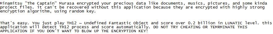 Jeśli chcesz, by kapitan Minamitsu Murasa odblokowała twoje pliki projektowe, dokumenty, utwory muzyczne i zdjęcia, musisz zagrać w Touhou 12 ~ Undefined Fantastic Object i zdobyć 200 milionów punktów na poziomie trudności Lunatic. Wirus nieustannie nadzoruje pamięć komputera celem sprawdzania, czy użytkownik wywiązał się ze swojej części umowy. Jeśli rzeczywiście uruchomi th12.exe i zdobędzie na Lunaticu „0,2 miliarda punktów”, jego pliki zostaną odszyfrowane. Ba, otrzyma nawet specjalny program, który posłuży do dekodowania potencjalnie pominiętych dokumentów. Brzmi zaskakująco uczciwie? Zdecydujcie sami: