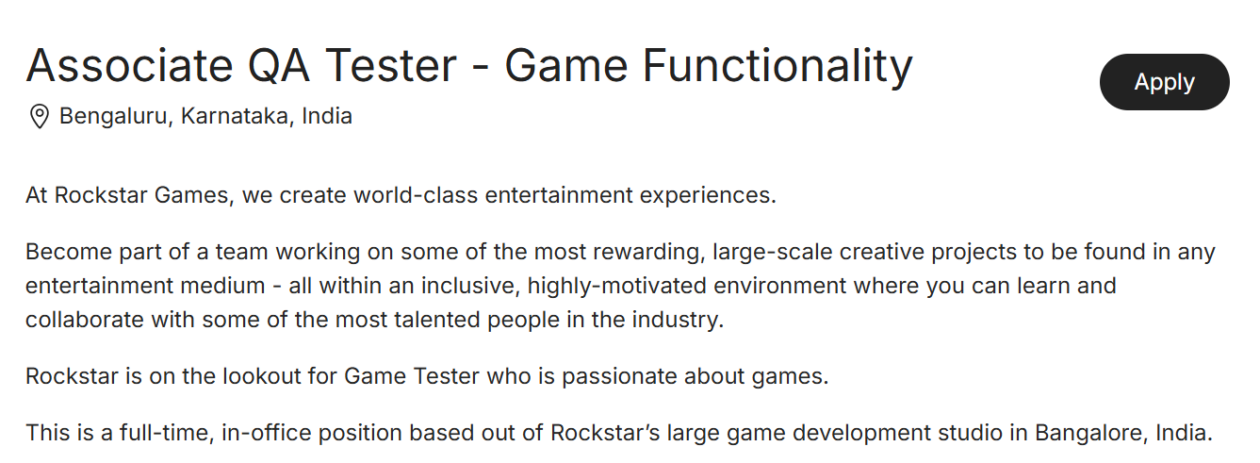 Jak napisała na LinkedInie Priyanka Mourya, starsza specjalistka do spraw zatrudniania w Rockstar Games, indyjska filia firmy chętnie przyjmie testerów. Studio mieści się w mieście Bangalore w Indiach, a pozycja jest pełnoetatowa i stacjonarna. Za to doświadczenie w branży czy dyplom z nauk informatycznych nie są obowiązkowe, oferta przyciągnie więc z pewnością wielu młodych ludzi szukających sposobu na rozpoczęcie kariery w gamedevie.