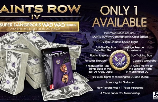 Jeśli ktoś wątpił, że Saints Row IV to produkcja z wszelkich względów szalona, chyba ostatecznie zmieni zdanie. Wydawca gry zapowiedział specjalną edycję Wad Wad Edition, która ukaże się w jednym egzemplarzu, będzie zawierać m.in. lot w kosmos i samochody, a jej cena wyniesie... milion dolarów. To nie żarty. Milion. Naprawdę.