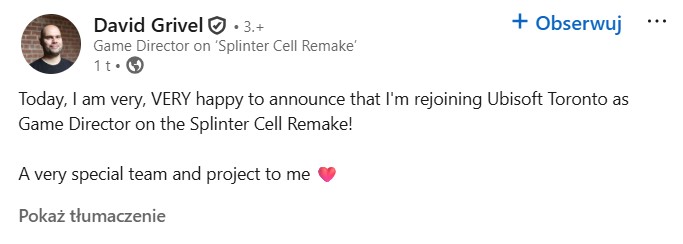 Do tego w międzyczasie w 2022 roku Splinter Cell Remake stracił reżysera, którym wówczas był David Grivel, wieloletni pracownik Ubisoftu pracujący wcześniej jako główny projektant zarówno ostatniej odsłony Splinter Cella o podtytule Blacklist, jak i trzech najnowszych Far Cry’ów. Wówczas zastąpiła go Andy Schmoll, lecz koniec końców i ona odeszła, z niewyjaśnionych powodów, w październiku tego roku, co zauważono po tym, że firma zaczęła szukać nowego reżysera projektu poprzez swoją stronę internetową. Teraz zaś dowiedzieliśmy się, kogo udało się jej znaleźć, i tym kimś okazał się… David Grivel.