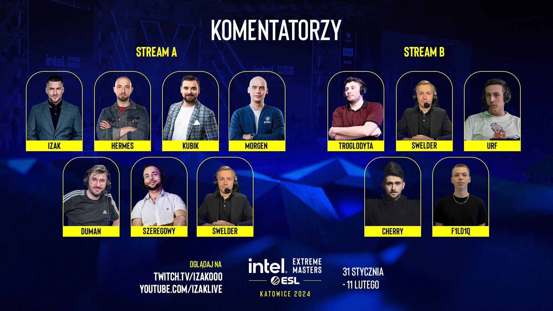 Już od środy na kanałach izaka w serwisie Twitch i Youtube będzie można oglądać transmisje z jego komentarzem, a obok niego za mikrofonem usiądą: Łukasz ‘Hermes’ Pożyczek, Kuba ‘KubiK’ Kubiak, Maciej ‘Morgen’ Żuchowski, Piotr ‘Duman’ Dumanowski, Olaf ‘Szeregowy’ Ostrowski, Jakub ‘Swelder’ Grzegorski, Sławek ‘Troglodyta’ Bąk, Mikołaj ‘URF’ Palimąka, Szczepan ‘Cherry’ Wałęga, oraz Filip ‘F1LD1Q’ Dikmajer.
