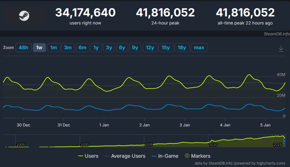 W ostatnich latach Steam tak często pobijał rekord zalogowanych jednocześnie użytkowników, że stało się to już tradycją, iż regularnie wracamy do tego tematu. Do ostatniego takiego sukcesu platformy Valve dołożył się Battlefield 6, który swoją premierą w październiku przyciągnął na Steama całą masę osób. W jednym momencie zalogowanych było wtedy 41 666 455 użytkowników.